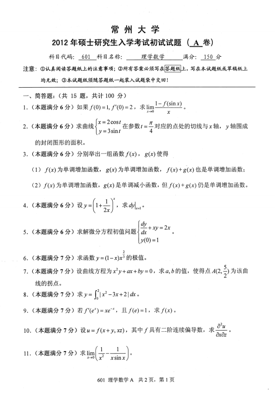 考研派 > 考研院校 > 江蘇 > 常州大學(xué) > 考研真題 > 2012年常州大學(xué)601理學(xué)數(shù)學(xué)考研試題 2012年常州大學(xué)601理學(xué)數(shù)學(xué)考研試題 【考研派】為大家提供2012年常州大學(xué)601理學(xué)數(shù)學(xué)考研試題,更多考研資訊請關(guān)注我們網(wǎng)站的更新!敬請收藏本站。 文章來源:2012年常州大學(xué)601理學(xué)數(shù)學(xué)考研試題 推薦閱讀 考研真題最近更新2012年常州大學(xué)850工程力學(xué)考研試題2012年常州大學(xué)852工程熱力學(xué)考研試題2012年常州大學(xué)812金屬學(xué)考研試題2012年常州大學(xué)620無機(jī)與分析化學(xué)考研試題2012年常州大學(xué)601理學(xué)數(shù)學(xué)考研試題 相關(guān)分類 研究生院招生簡章聯(lián)系方式考研復(fù)試成績查詢研究生專業(yè)考研報(bào)錄比考研分?jǐn)?shù)線專業(yè)排名參考書目研究生導(dǎo)師考研問題考研真題考研經(jīng)驗(yàn)