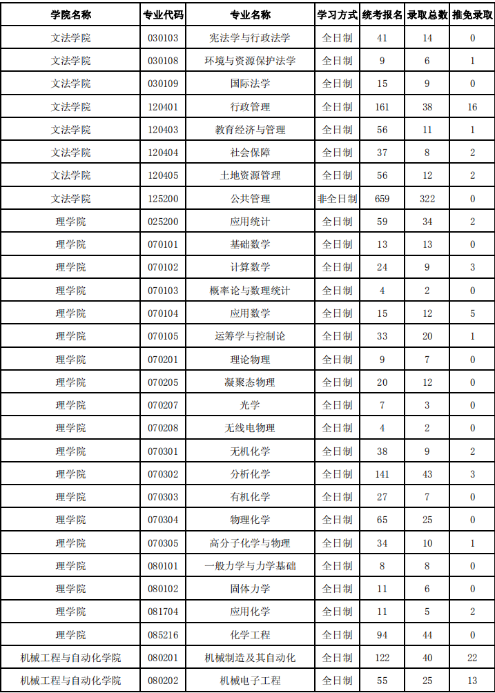 學(xué)院碼 學(xué)院名稱 專業(yè)代碼 專業(yè)名稱 研究方向(群)名稱 學(xué)習(xí)方式 報(bào)考人數(shù) 錄取總數(shù) 推免錄取 001 文法學(xué)院 030100 法學(xué) 不區(qū)分研究方向 全日制 44 15 3 001 文法學(xué)院 120400 公共管理 不區(qū)分研…… 日期:11-02 閱讀量:22156