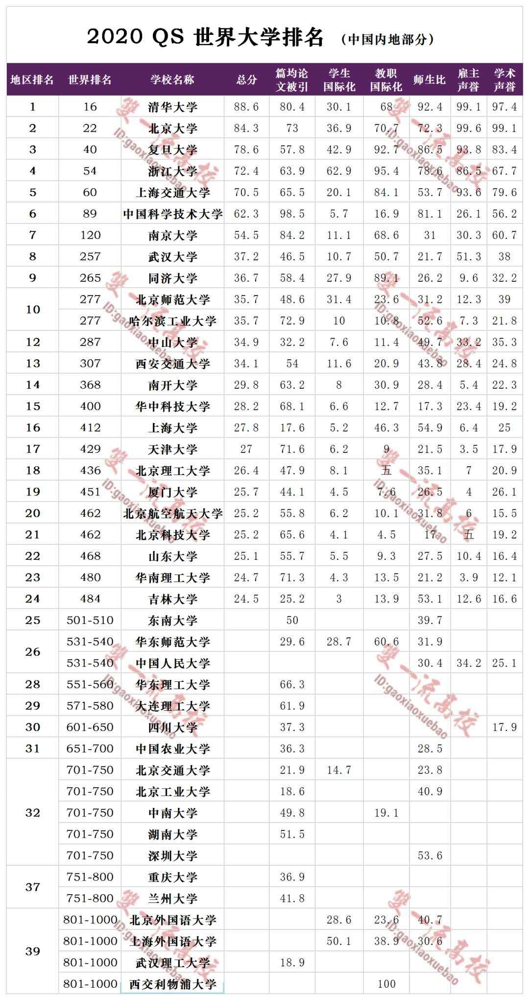 2020QS世界大學排名中國大學上榜名單一覽(完整榜單)