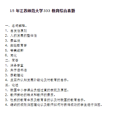 考研派 > 考研院校 > 江蘇 > 江蘇師范大學 > 考研真題 > 2015年江蘇師范大學333教育綜合真題 2015年江蘇師范大學333教育綜合真題 【考研派】為大家提供2015年江蘇師范大學333教育綜合真題,更多考研資訊請關(guān)注我們網(wǎng)站的更新!敬請收藏本站。 文章來源:2015年江蘇師范大學333教育綜合真題 推薦閱讀 考研真題最近更新2013年江蘇師范大學馬克思主義理論考研真題2016年江蘇師范大學書法學專業(yè)考試真題2016年江蘇師范大學中國通史考研真題2015年江蘇師范大學333教育綜合真題2011年江蘇師范大學區(qū)域分析與區(qū)域規(guī)劃考研試題(回憶版) 相關(guān)分類 研究生院招生簡章聯(lián)系方式考研復(fù)試成績查詢研究生專業(yè)考研報錄比考研分數(shù)線專業(yè)排名參考書目研究生導(dǎo)師考研問題考研真題考研經(jīng)驗
