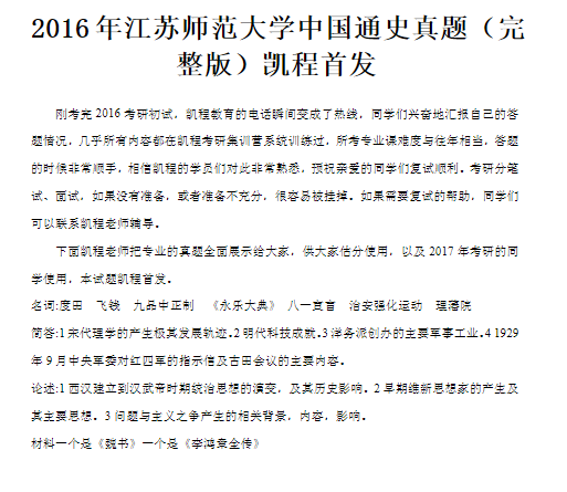 考研派 > 考研院校 > 江蘇 > 江蘇師范大學 > 考研真題 > 2016年江蘇師范大學中國通史考研真題 2016年江蘇師范大學中國通史考研真題 【考研派】為大家提供2016年江蘇師范大學中國通史考研真題,更多考研資訊請關注我們網站的更新!敬請收藏本站。 文章來源:2016年江蘇師范大學中國通史考研真題 推薦閱讀 考研真題最近更新2013年江蘇師范大學馬克思主義理論考研真題2016年江蘇師范大學書法學專業考試真題2016年江蘇師范大學中國通史考研真題2015年江蘇師范大學333教育綜合真題2011年江蘇師范大學區域分析與區域規劃考研試題(回憶版) 相關分類 研究生院招生簡章聯系方式考研復試成績查詢研究生專業考研報錄比考研分數線專業排名參考書目研究生導師考研問題考研真題考研經驗