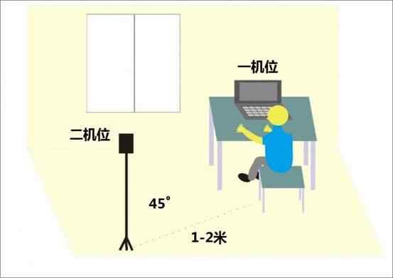 【二機位】:設備攝像頭從考生側后方45度、1-2米處拍攝,需全程清晰顯示考生和主機位屏幕。復試過程中設備麥克風和揚聲器保持靜音,僅開啟攝像頭功能。復試前手持二機位設備,環繞360度向復試小組展示復試環境。復試中如有必要,考生需根據考官指令隨時變換機位位置。