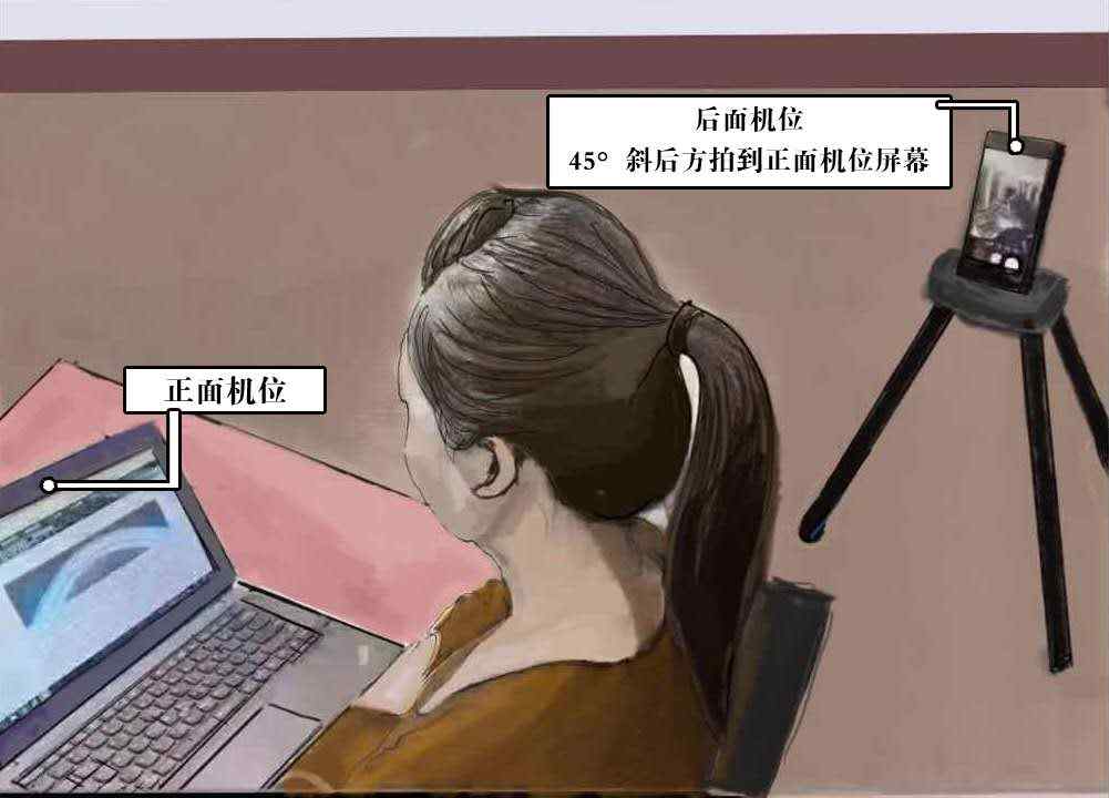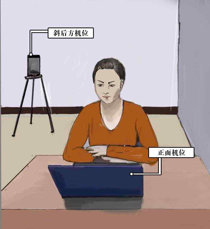 ②第二機位為面試副機位(監考機位,可以是手機或平板電腦)。設備攝像頭從考生側后方成45°1—2米處拍攝,要保證考生主機位屏幕和雙手清晰地被復試考官組看到。關閉移動設備的通話、錄音、錄屏、直播、外放音樂、鬧鐘等可能影響面試的應用程序,并保持平臺軟件靜音。