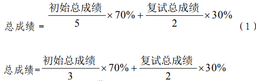總成績=初試總成績/5×70%+復試總成績×30%(1) 總成績=初試總成績/3×70%+復試總成績×30%(2)
