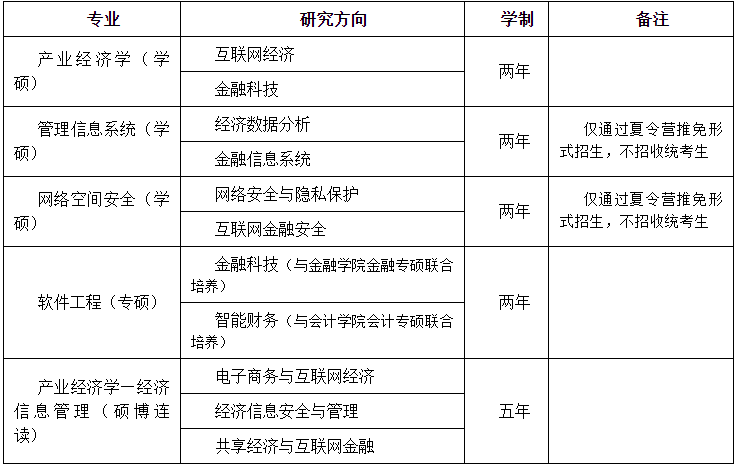 2019年學院碩士研究生的招生專業包括產業經濟學(學碩和碩博連讀)、管理信息系統(學碩)、網絡空間安全(學碩)、軟件工程(專碩)共4個專業。各專業研究方向如下表所示: