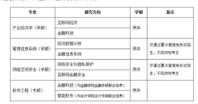 2020年學院碩士研究生的招生專業包括產業經濟學(學碩)、管理信息系統(學碩)、網絡空間安全(學碩)、軟件工程(專碩)共4個專業。各專業研究方向如下表所示: