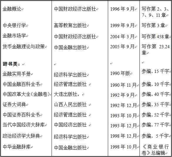 出版有個人專著《經濟發展中的金融中介》,主編教材《信托與融資租賃》、《金融市場、工具與金融機構》、《商業銀行業務與經營》、《現代商業銀行業務教程》,參編教材《金融中介學》,參與編著《20世紀西方貨幣金融理論研究:進展與評述》,曾先后在《財貿經濟》、《財政研究》等雜志上發表論文數十篇。參加了“21世紀中國金融學專業教育教學改革與發展戰略研究”、“中國經濟發展階段演進與金融發展的總量及結構分析”等教育部重大課題研究。