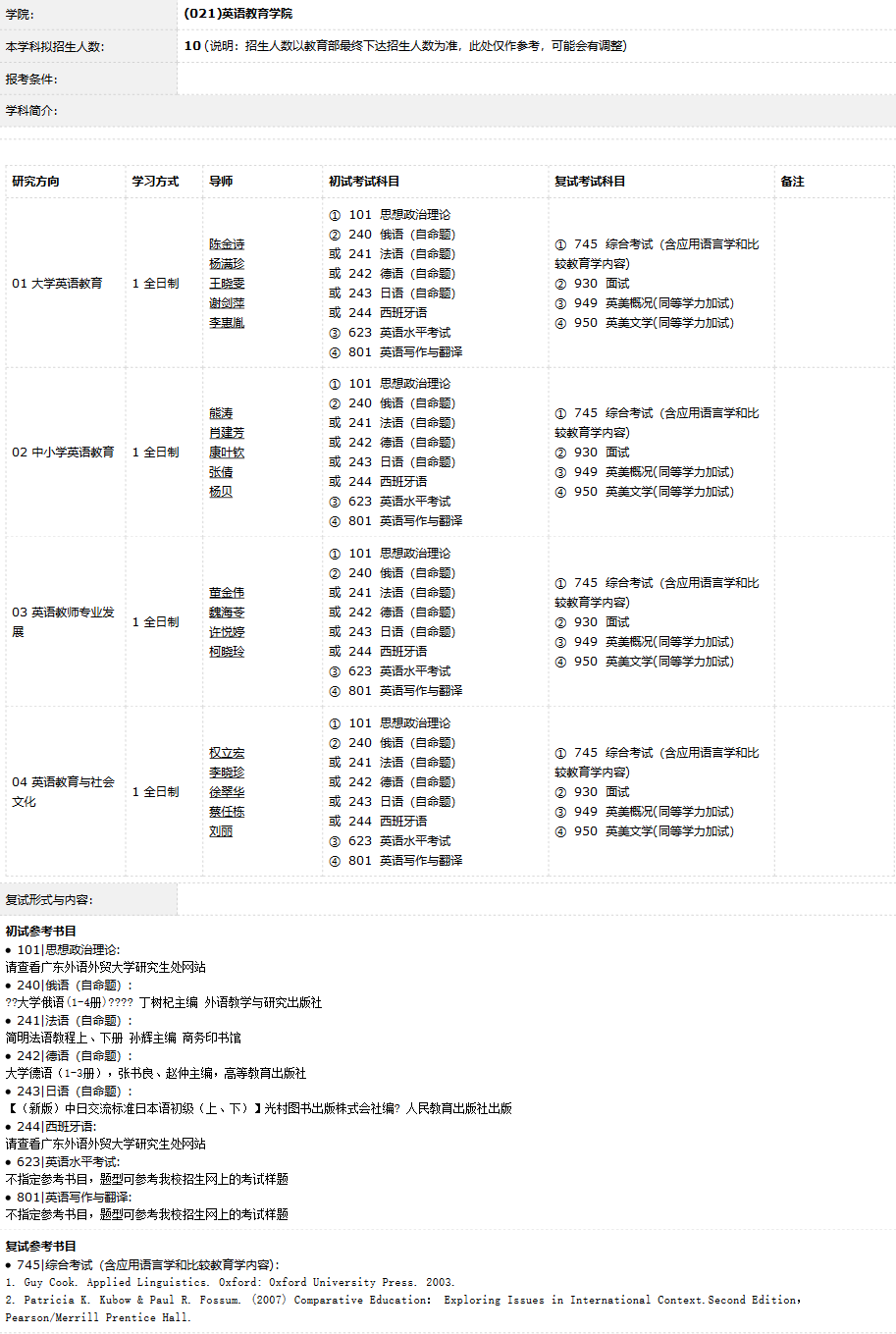 考試科目: | ① 101 思想政治理論 ② 240 俄語(自命題)或 241 法語(自命題)或 242 德語(自命題)或 243 日語(自命題)或 244 西班牙語(自命題) ③ 623 英語水平考試 ④ 801 英語寫作與翻譯① 745 綜合考試(含應用語言學和比較教育學內容) ② 930 面試 ③ 949 英美概況 (同等學力加試) ④ 950 英美文學(同等學力加試) |