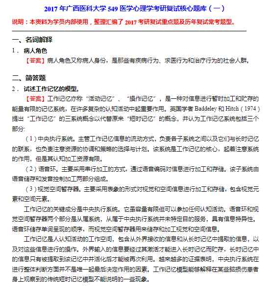 以下資料由廣西醫(yī)科大學(xué)醫(yī)學(xué)心理學(xué)研究生團(tuán)隊(duì)整理提供,其團(tuán)隊(duì)成員覆蓋各個(gè)院系,專門(mén)搜集本校的考研真題和高分筆記、題庫(kù)等資料。