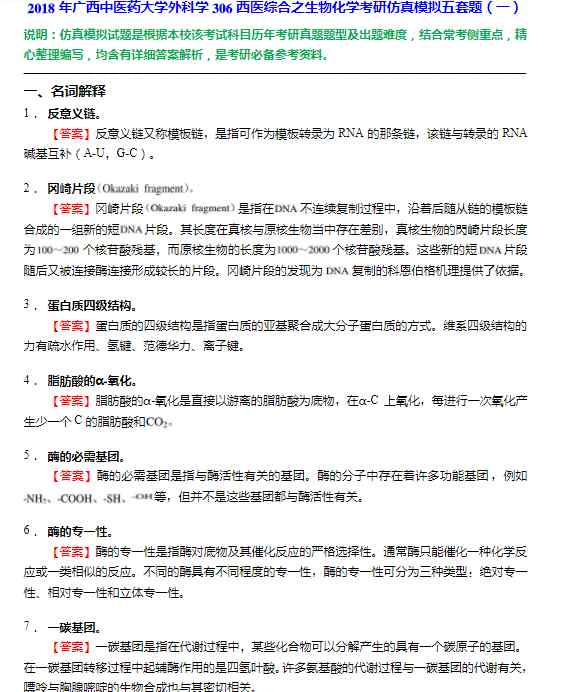 2018年廣西中醫藥大學外科學306西醫綜合之生物化學考研真題