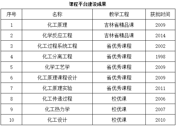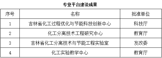 我校1958年設立的有機化工專業、無機化工專業和1978年以后增設的化學工程專業、石油加工專業發展而來,1998年國家專業調整合并為化學工程與工藝專業。化學工程與工藝專業是國家級特色專業,是吉林省首家和全國地方工科院校中第一個通過教育部工程教育化學工程與工藝專業認證的專業,2011年被列入教育部第二批“卓越工程師教育培養計劃”(各項榮譽、成績及平臺見下表)。