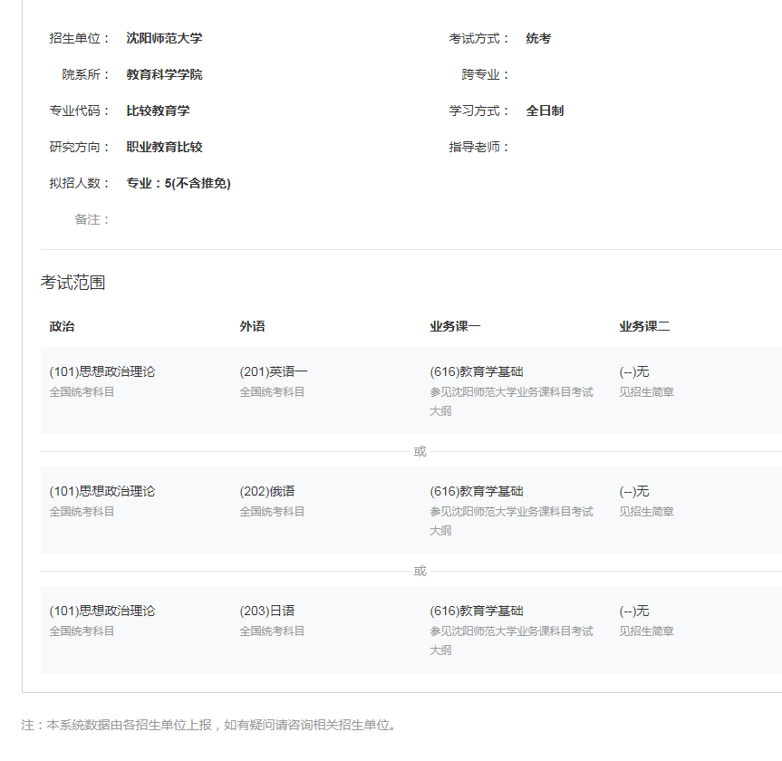 考試科目: | ①(101)思想政治理論 ②(201)英語一 ③(311)教育學專業基礎綜合 ④(--)無 或①(101)思想政治理論 ②(202)俄語 ③(311)教育學專業基礎綜合 ④(--)無 或①(101)思想政治理論 ②(203)日語 ③(311)教育學專業基礎綜合 ④(--)無 |