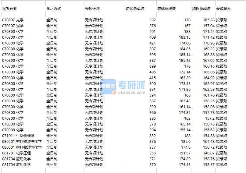 06結構化學 | 全日制 | ①101思想政治理論;②201英語一;③721物理化學(含結構化學);④837有機化學(或)838無機化學和分析化學 | ||
