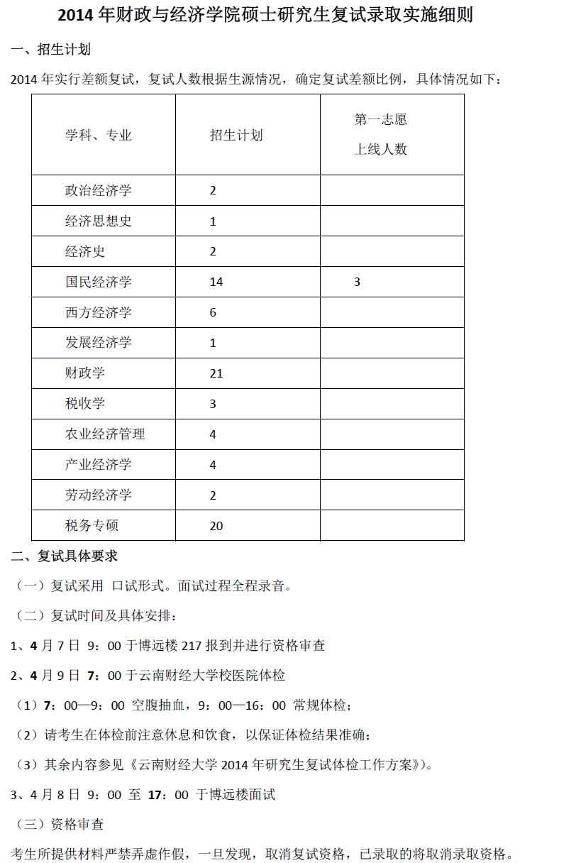 2014年云南財經大學財政與經濟學院研究生考研復試細則