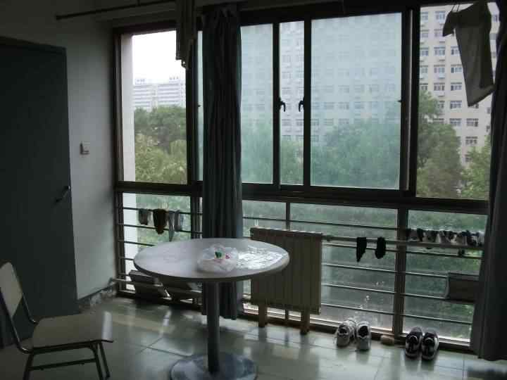 4、男生宿舍:三人一間臥室,兩間一套,共用一個封閉陽臺,有落地窗戶,陽光明媚。陽臺內設兩個衛生間、一個洗漱間和一個儲物間。有空調。