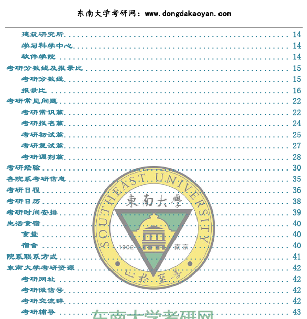內容手冊里面包含各種東大的考研信息:校園風景、各學院概況、考研報錄比、考研分數線、研究生招生電話、考研經驗、考研資料和輔導的購買方式、東大考研QQ群、學姐微信號等信息,還有學姐學長定期答疑QQ群號。