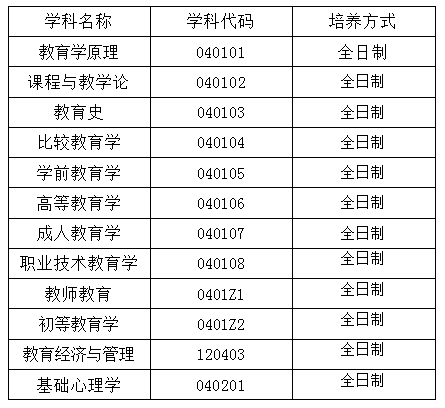 專業名稱:教育學原理,課程與教學論,教育史,比較教育學,學前教育學,高等教育學,成人教育學,職業技術教育學,教師教育,初等教育學,教育經濟與管理,基礎心理學,現代教育技術,教育管理