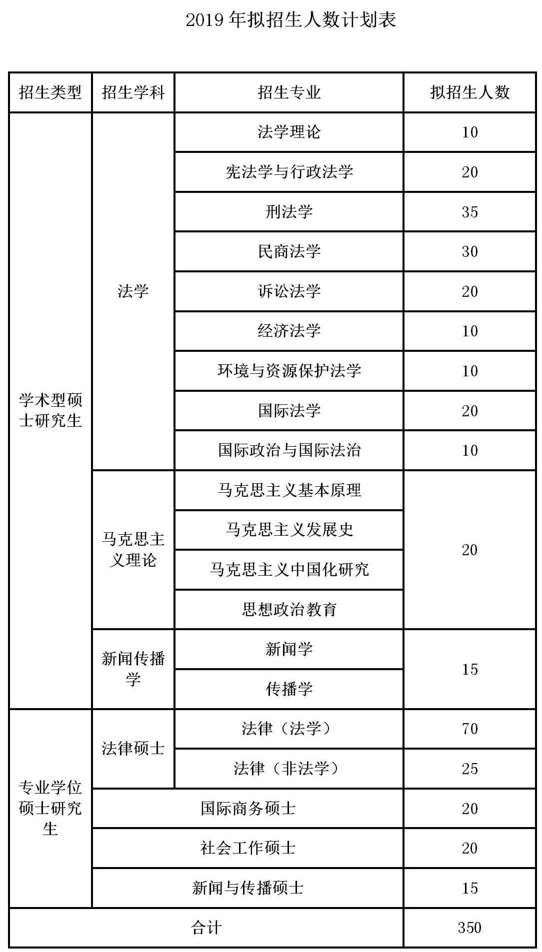 2019年我校擬招收碩士研究生約350名,其中學(xué)術(shù)型碩士研究生約200名,專業(yè)學(xué)位碩士研究生約150名,具體擬招生計(jì)劃人數(shù)參見下表。法律碩士考生網(wǎng)上報(bào)名時(shí)需選報(bào)培養(yǎng)方向,參加我校復(fù)試可以再次明確。