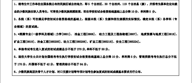 3、*照顧專業(一級學科):力學[0801]、冶金工程[0806]、動力工程及工程熱物理[0807]、地質資源與地質工程[0818]、礦業工程[0819]。