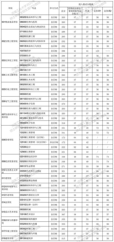 2021河南工業大學考研分數線(研究生復試分數線)