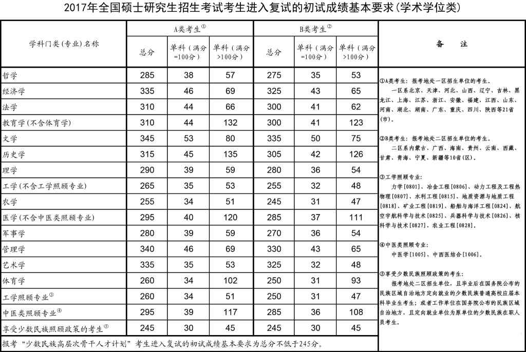 哲學 | 300 | 42 | 63 | 290 | 39 | 59 | ①A類考生:報考地處一區招生單位的考生。一區系北京、天津、河北、山西、遼寧、吉林、黑龍江、上海、江蘇、浙江、安徽、福建、江西、山東、河南、湖北、湖南、廣東、重慶、四川、陜西等21省(市)。②B類考生:報考地處二區招生單位的考生。二區系內蒙古、廣西、海南、貴州、云南、西藏、甘肅、青海、寧夏、新疆等10省(區)。③工學照顧專業:力學[0801]、冶金工程[0806]、動力工程及工程熱物理[0807]、水利工程[0815]、地質資源與地質工程[0818]、礦業工程[0819]、船舶與海洋工程[0824]、航空宇航科學與技術[0825]、兵器科學與技術[0826]、核科學與技術[0827]、農業工程[0828]。④中醫類照顧專業:中醫學[1005]、中西醫結合[1006]。⑤享受少數民族照顧政策的考生:報考地處二區招生單位,且畢業后在國務院公布的民族區域自治地方定向就業的少數民族普通高校應屆本科畢業生考生;或者工作單位和戶籍在國務院公布的民族區域自治地方,且定向就業單位為原單位的少數民族在職人員考生。 |