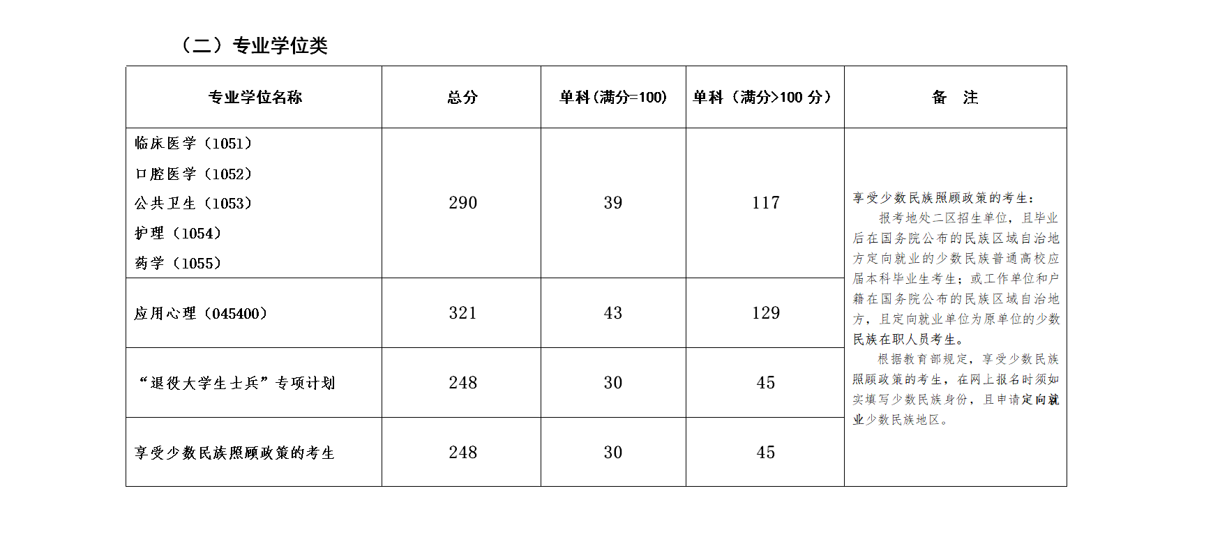 *A類考生:報考地處一區招生單位的考生。 *B類考生:報考地處二區招生單位的考生。 一區系北京、天津、河北、山西、遼寧、吉林、黑龍江、上海、江蘇、浙江、安徽、福建、江西、山東、河南、湖北、湖南、廣東、重慶、四川、陜西等21省(市); 二區系內蒙古、廣西、海南、貴州、云南、西藏、甘肅、青海、寧夏、新疆等10省(區)。 *工學照顧專業:力學[0801]、冶金工程[0806]、動力工程及工程熱物理[0807]、水利工程[0815]、地質資源與地質工程[0818]、礦業工程[0819]、船舶與海洋工程[0824]、航空宇航科學與技術[0825]、兵器科學與技術[0826]、核科學與技術[0827]、農業工程[0828]。 *中醫類照顧專業:中醫學[1005]、中西醫結合[1006]。 *享受少數民族政策的考生:①報考地處二區招生單位,且畢業后在國務院公布的民族區域自治地方就業的少數民族普通高校應屆本科畢業生考生;或者②工作單位在國務院公布的民族區域自治地方,為原單位定向或委托培養的少數民族在職人員考生。 |